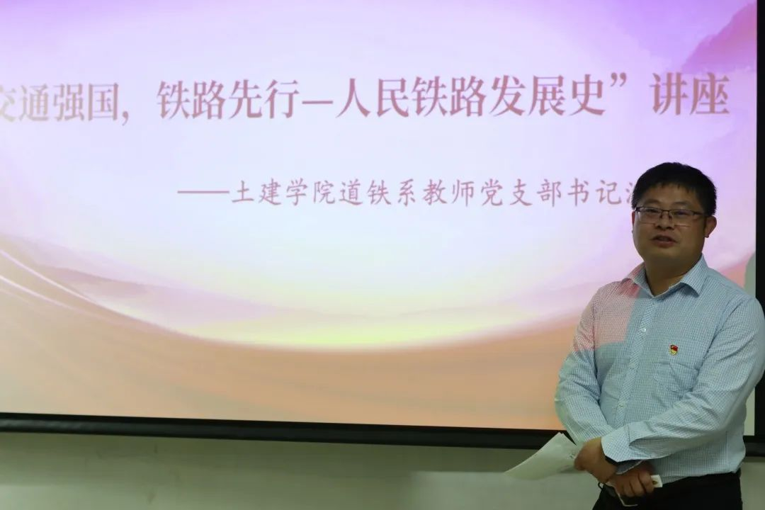 土建学院道铁系教师党支部书记、教授、博士生导师沈宇鹏同志向参会师生作了“交通强国,铁路先行——人民铁路发展史”主题讲座。沈宇鹏教授从举步维艰的中国铁路、奋发图强的中国铁路以及新时代交通强国铁路先行规划纲要三方面对中国铁路从无到有、由衰至盛,从辛酸屈辱到繁荣发展,从效率低下、布局畸形到四通八达、世界领先的曲折历程作了生动详尽的讲解,同时结合“十四五”规划、2035年远景目标和“一带一路”倡议,对新时代中国铁路的未来发展进行了展望。同志们、同学们被沈宇鹏教授富有激情、深入浅出的讲解深深触动,由衷地为伟大的祖国、民族和人民感到骄傲和自豪。在互动环节,沈宇鹏教授耐心细致而不失风趣地回答了大家的提问,同时分享了自己的亲身经历和感受,鼓励大家在各自的专业领域上,为全面建设社会主义现代化国家努力学习、踏实工作,参与书写新的历史篇章。
