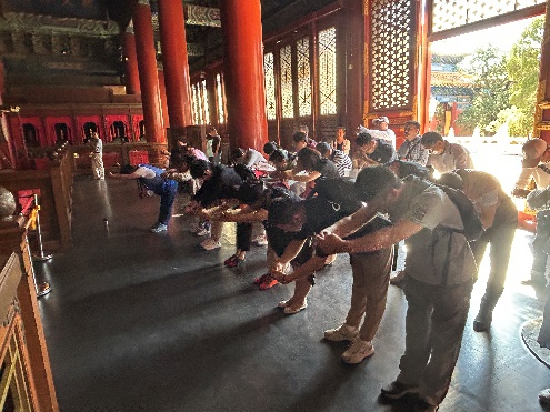 北京孔庙和国子监博物馆始建于14世纪,历经元、明、清三代,至今已有700多年的历史。是古代皇帝祭祀孔子的场所和中央最高学府。两组建筑群采用沿中轴线而建、左右对称的中国传统建筑方式充分体现了我国古代教育思想与儒家文化的传承理念。学院教师在讲解员带领下先后参观了进士碑林、大成殿、崇圣祠、辟雍殿、彝伦堂、敬一亭等地,重新回顾了我国持续长达1300多年的科举制度,科举制度的建立,打破了社会阶层之间的壁垒,为国家造就了大批栋梁之才,更是提高了整个中国社会教育的普及和发展,对后世影响深远。