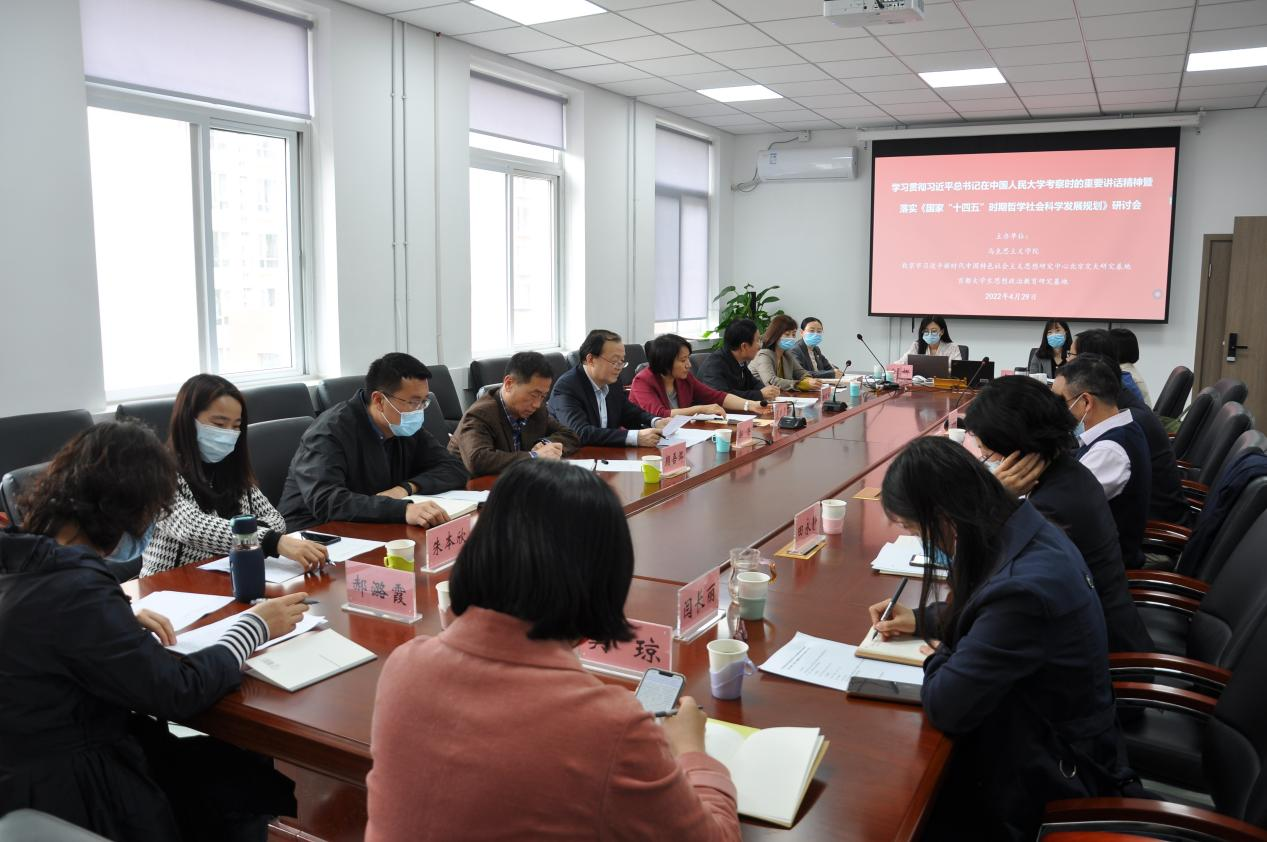 2022年4月29日,15vip太阳集团官网15vip太阳集团官网、北京市习近平新时代中国特色社会主义思想研究中心15vip太阳集团官网研究基地、首都大学生思想政治教育研究基地共同举办的学习贯彻习近平总书记在中国人民大学考察时的重要讲话精神暨落实《国家“十四五”时期哲学社会科学发展规划》研讨会,在15vip太阳集团官网举行。校党委副书记、纪委书记郭海,党委常委、党委宣传部部长蓝晓霞出席研讨会并讲话,15vip太阳集团官网党委书记孙冬梅主持会议。